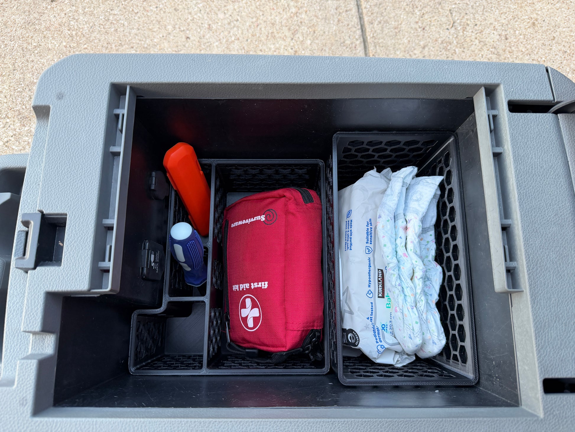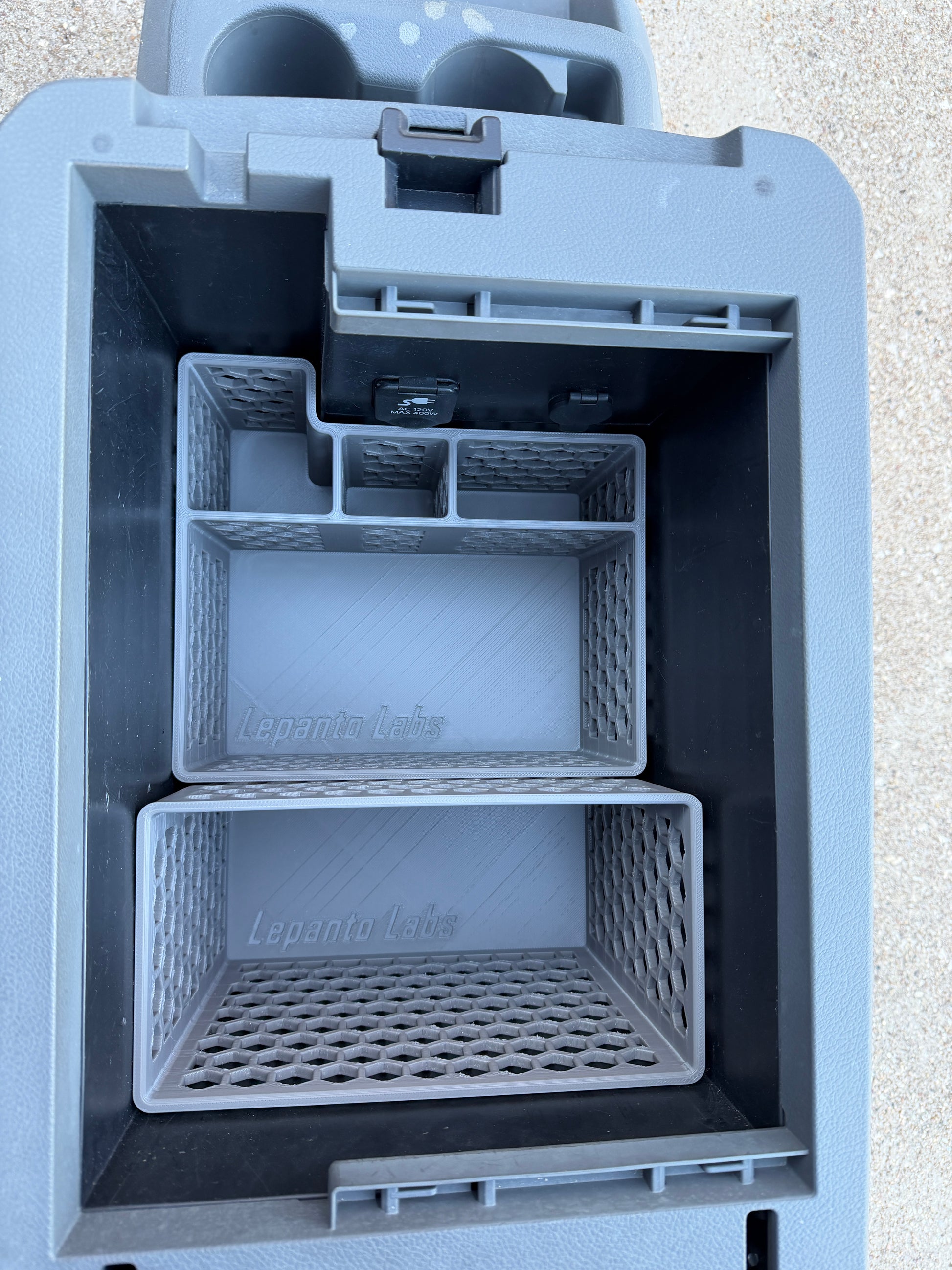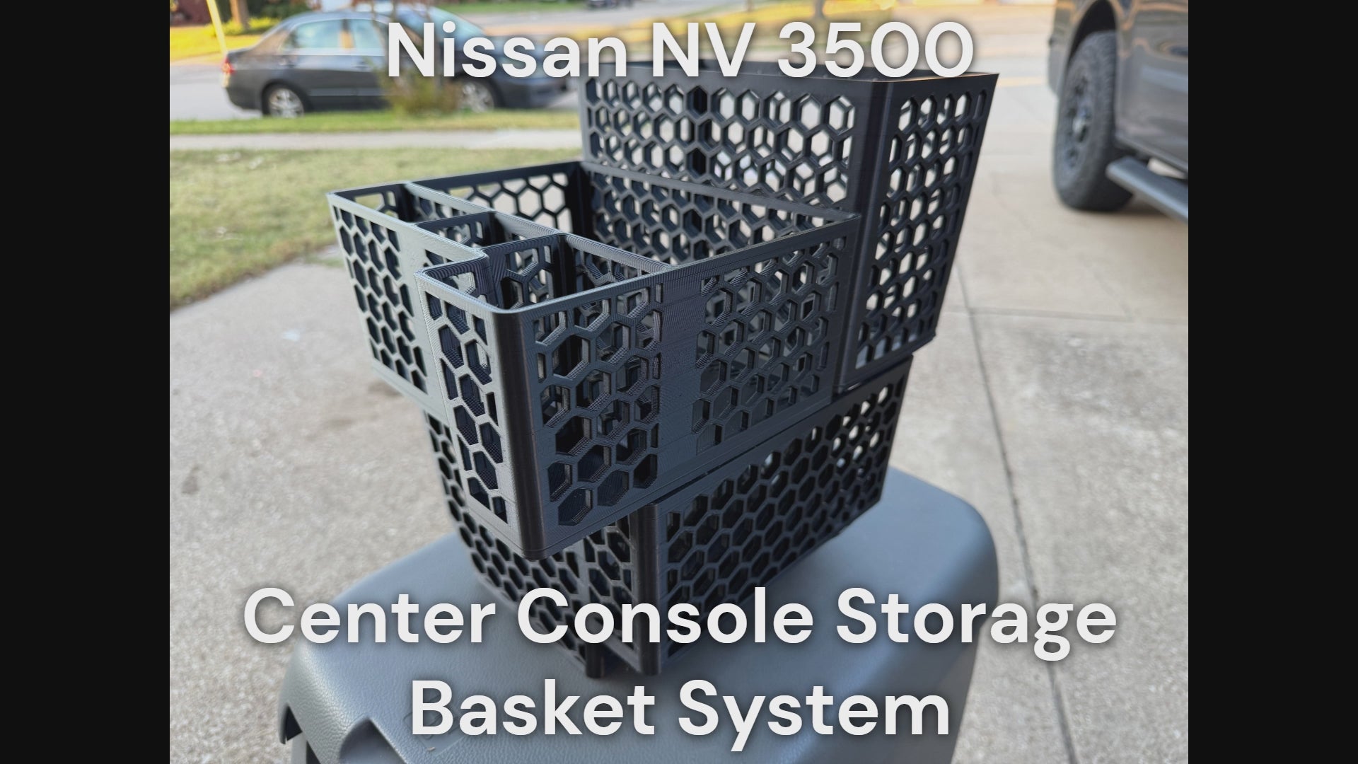 Unique custom-fit storage baskets for the Nissan NV 3500 Center Console. These baskets are 3D printed from durable, heat-resistant ABS plastic and help to bring order to the gigantic chasm that is the center console.